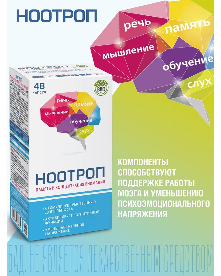 Биологически активная добавка Ноотроп для улучшения памяти и внимания 48капсул-