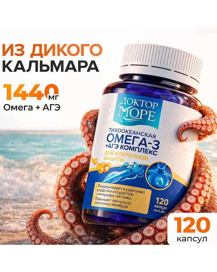 5Омега -3 + АГЭ комплекс Доктор Море тихоокеанская из печени дикого кальмара 120 капсулОтличное качество, рекомендую
