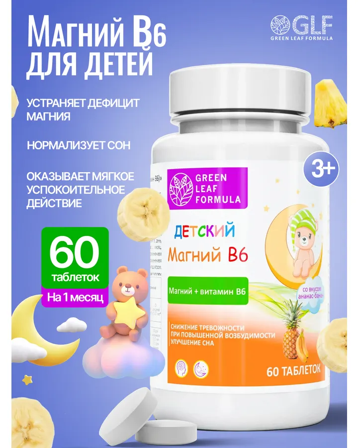 Магний В6 жевательный ананас Green Leaf Formula банан витамины для детей для нервной системы успокоительное для сна