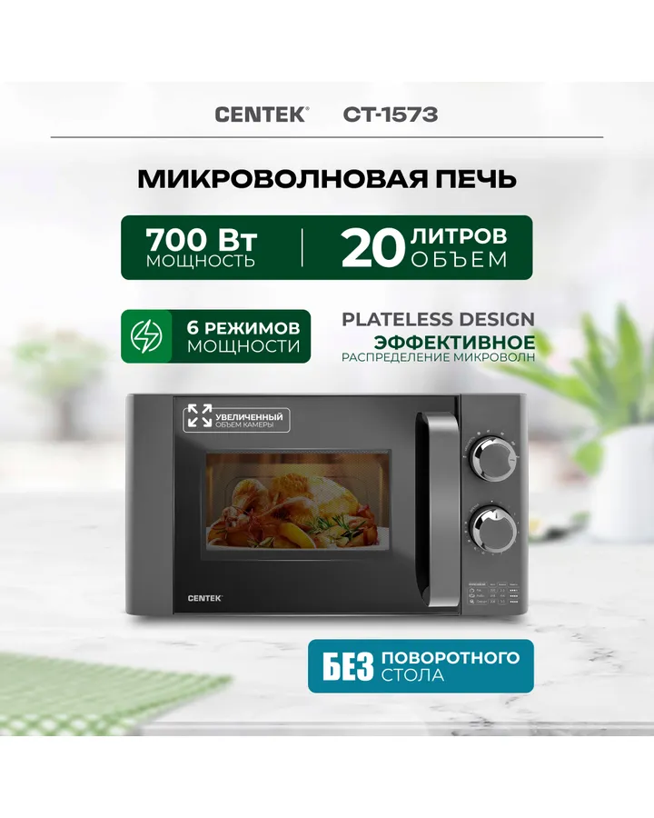Микроволновая печь CENTEK CT-1573 700Вт 20л 6 режимов без поворотного стола керамика