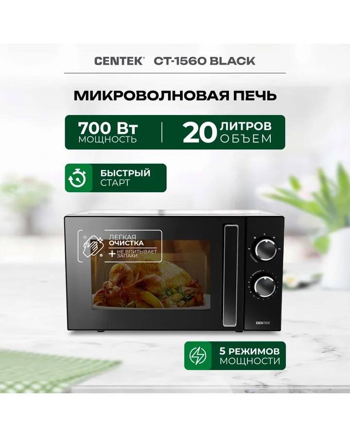 Микроволновая печь CENTEK CT-1560 Черная 700Вт 20л 5 режимов подсветка открывание дверцы ручкой