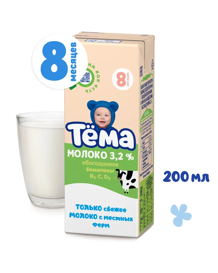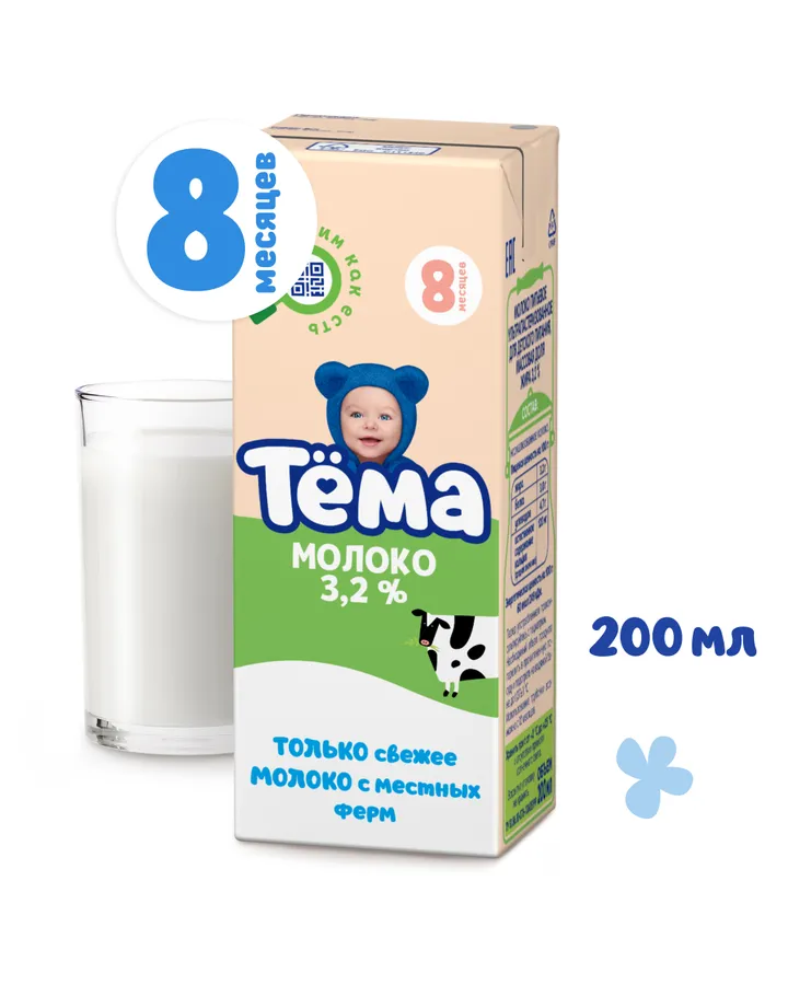 Молоко детское Тёма питьевое ультрапастеризованное 3,2% с 8 мес.200 мл.