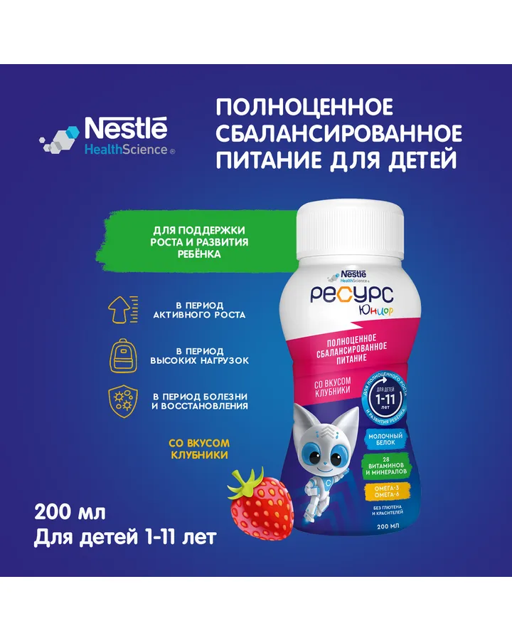 Смесь Nestle Health Science Ресурс Юниор со вкусом клубники 200мл с 12 месяцевПокупаю старшей дочке для быстрого и полезного перекуса и набора массы тела