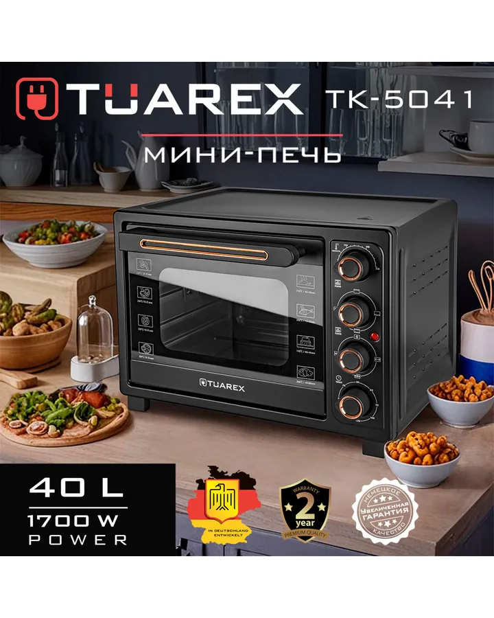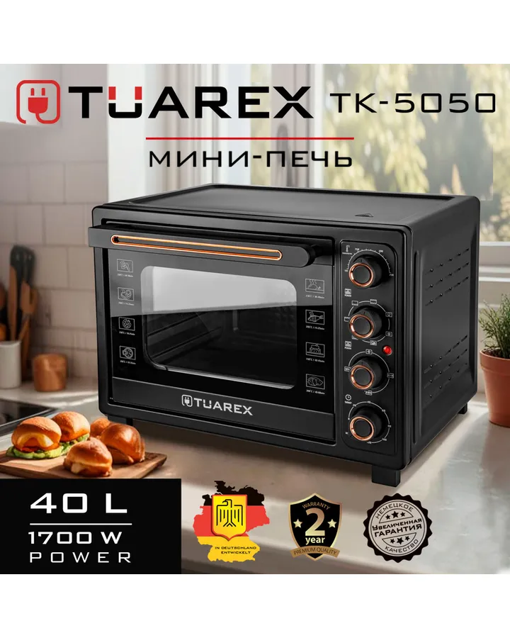 Мини-печь TUAREX TK-5066Она классная,))) я такая довольная что ее купила,и ещё по такой цене урвали с акцией) Большая,не шумная), запекала и крылья и рыбу ничего не пригорает