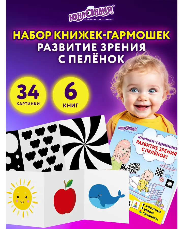 Развивающие карточки Юнландия для новорожденных 6 книжек для развития зрения с пеленок