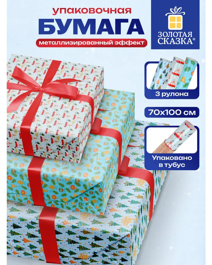 Упаковочная бумага Золотая сказка для новогодних подарков в рулоне 70х100 см набор 3 штуки