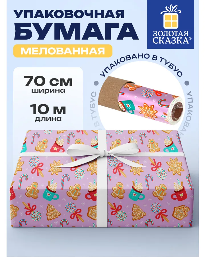 Упаковочная бумага Золотая сказка для новогодних подарков в рулоне 70 см х 10 м Сладости
