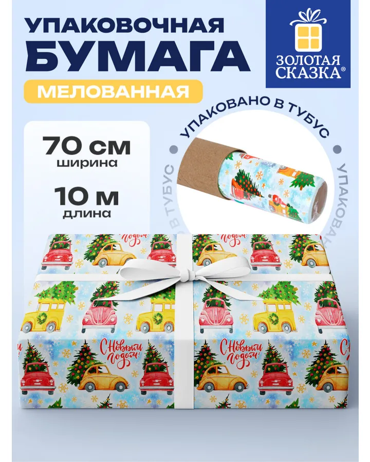 Упаковочная бумага Золотая сказка для новогодних подарков в рулоне 70 см х 10 м Машинки