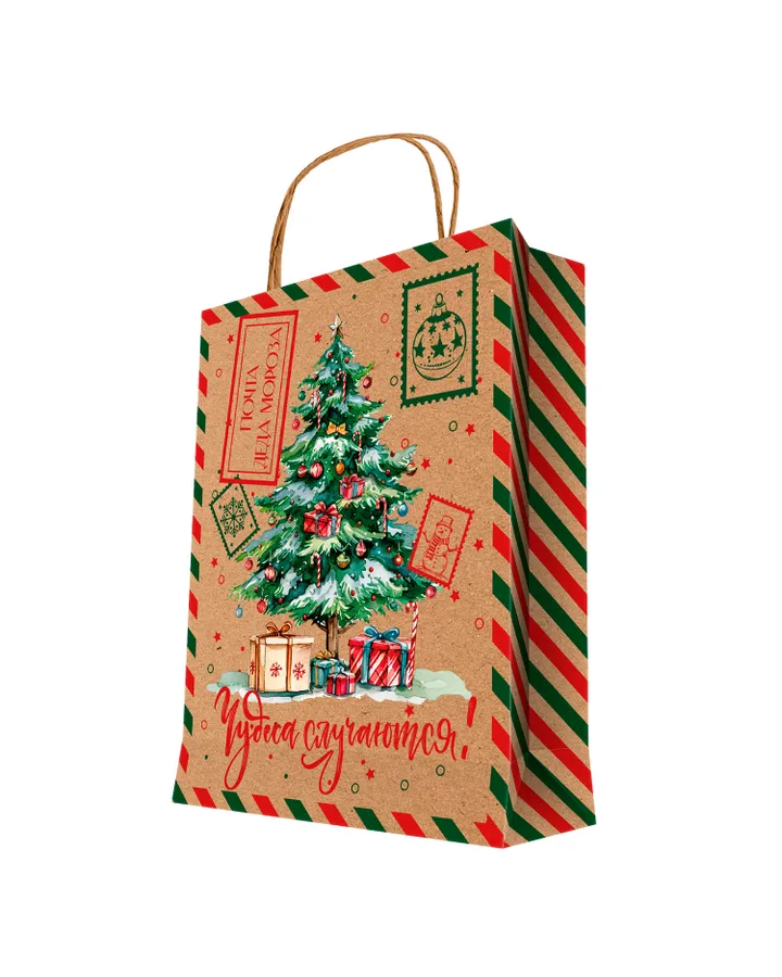 Пакет подарочный новогодний Феникс Презент Почта Деда Мороза из крафт-бумаги 26*33*13см