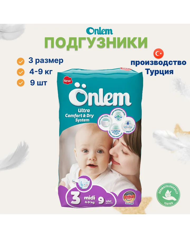 Подгузники Onlem для новорожденных 3 (4-9 кг) 9 шт.Намного лучше голубых Onlem - ultra comfort & dry system: эти меньше протекают, не пахнут духами, приятнее на ощупь, однако натиск дешевизны присутствует - они тоже плохо впитывают, что не мудрено, если учитывать их внутренний вид.
