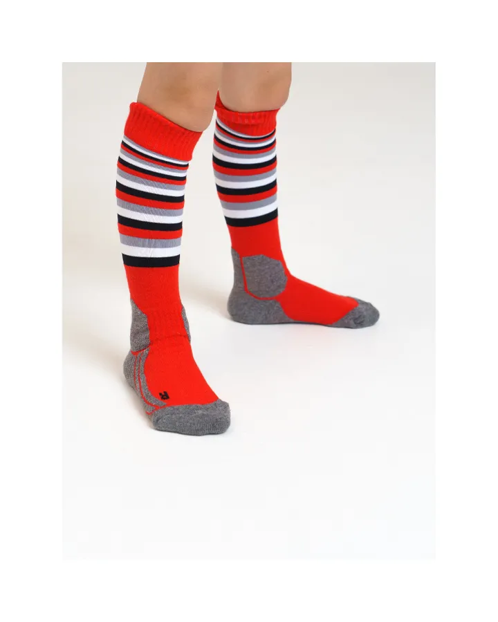 Лучше выбирать высокие носки из хлопка с эластаном, которые плотно облегают ногу и имеют усиленные резинки, чтобы они не спадали во время активных движений.