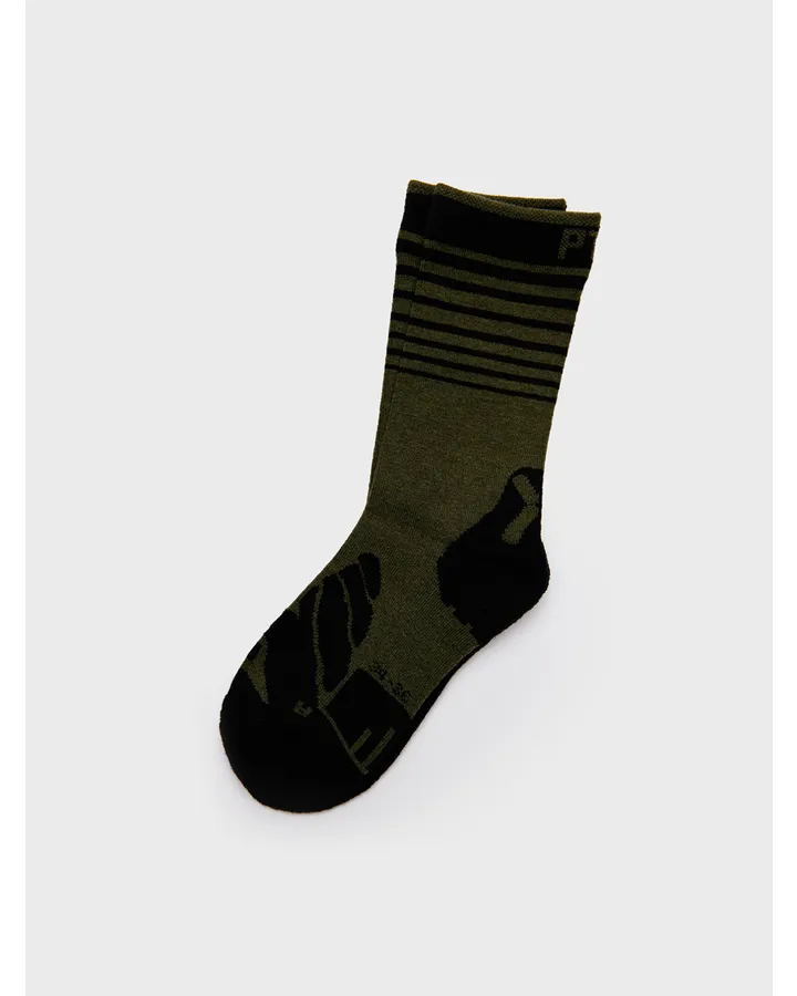 Лучше выбирать высокие носки из хлопка с эластаном, которые плотно облегают ногу и имеют усиленные резинки, чтобы они не спадали во время активных движений.