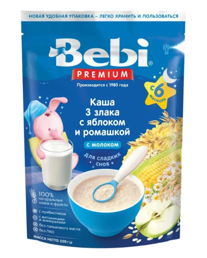 Молочная каша Bebi Premium 3 злака с яблоком и ромашкой