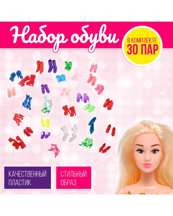 В пакете 30 пар, некоторые не налезают на ногу барби, но подходят другим куклам с ногой поменьше. Мы хотели, чтобы были сапоги, но к сожалению, не попались. Хороший товар, рекомендую.