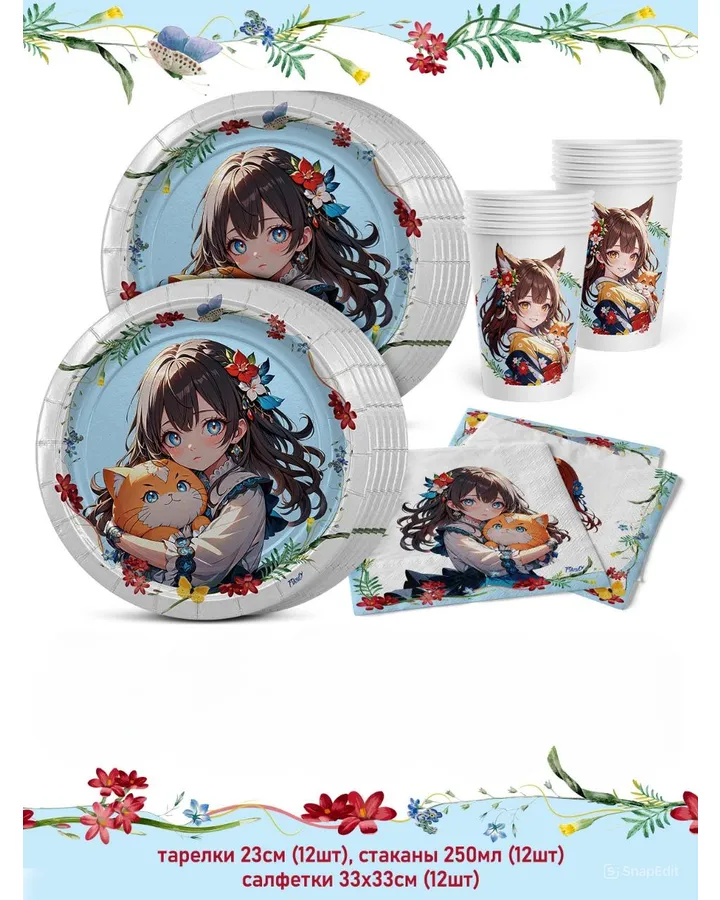 Набор одноразовой посуды PRIORITY Аниме 12 стаканов 12 тарелок 12 салфеток