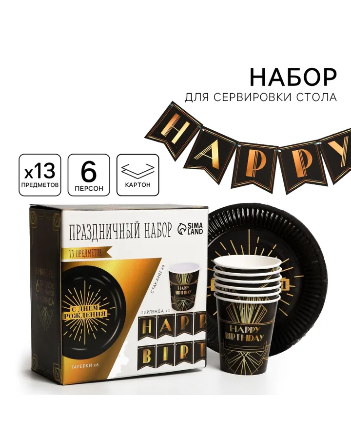 Набор бумажной посуды Страна карнавалия Happy party 6 тарелок 6 стаканов 1 гирлянда