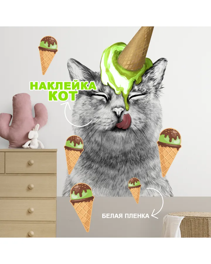 Интерьерная наклейка на стену Woozzee Кот с зеленым мороженым для декора и украшения комнаты