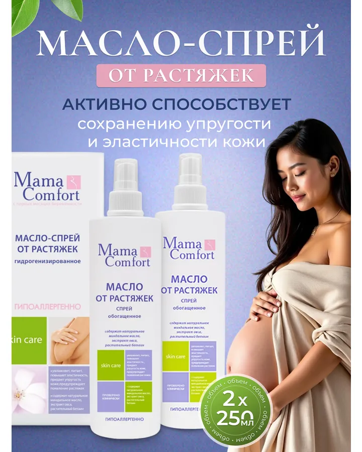 Масло Mama Com.fort 2 шт.Очень хорошо увляжнает кожу после душа ,но оставляет после себя липкий слой .нужно не много подождать ,что бы все пропиталось и потом одевать одежду