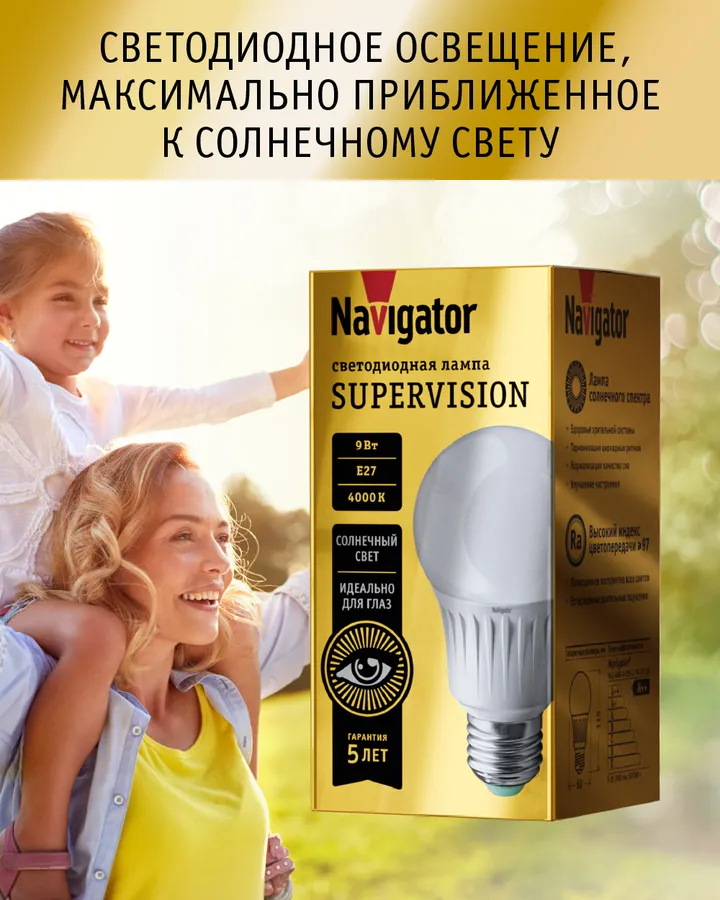 Светодиодная лампочка NaVigator солнечного света безопасная для зрения Е27 4000К 9Вт