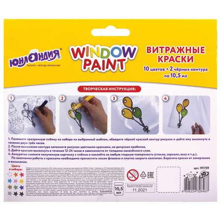 Витражные краски – это специальные материалы, которые подходят для работы с различными видами стекла. Их можно использовать для создания красивых картинок на окнах, вазах, бутылках и других стеклянных поверхностях. Эти краски безопасны для детей и легко моются водой, что делает процесс творчества удобным и безопасным.