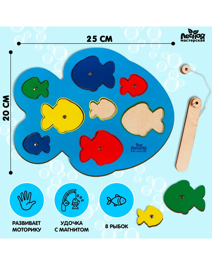 Набор для творчества Лесная мастерскаяОчень хорошая игра для изучения цветов, большой/ маленький и право/лево. Играть только вместе с ребёнком нужно конечно, он может взять в рот рыбку, магнит от удочки или намотать верёвку на шею.