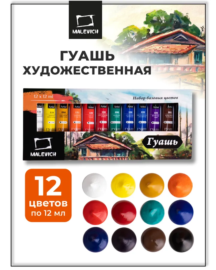 Гуашь Гамма Оранжевое солнце 12 цветов (10 классических+золотой+серебряный) 180120222