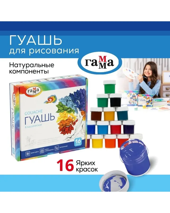 • Широкий ассортимент гуашевых красок
