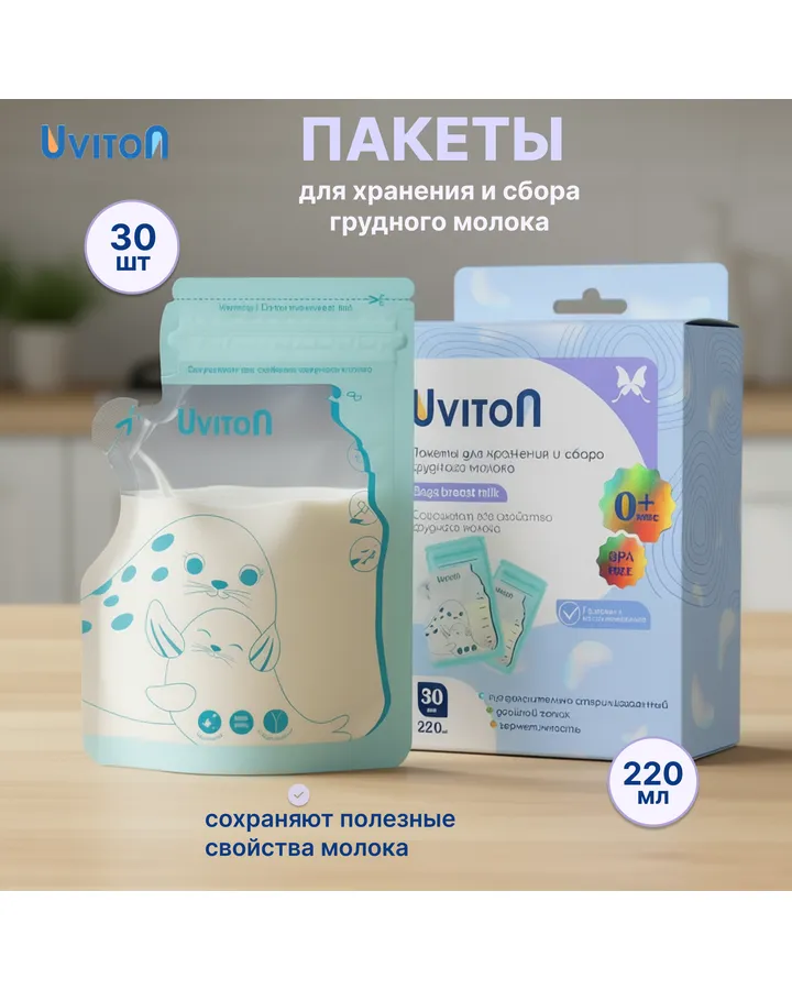 Пакеты для хранения и сбора Uviton грудного молока 30шт 220 млОтличные пакеты, не проливаются, надежный и крепкий замок, удобный носик для слива в бутылочку