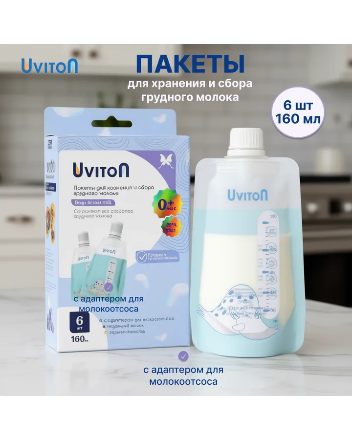 5Пакеты для молока Uviton для хранения и сбора 6 шт 160 млОчень удобно с крышечками И очень удобно, что можно сразу к молокоотсосу присоединить (у меня Авент)