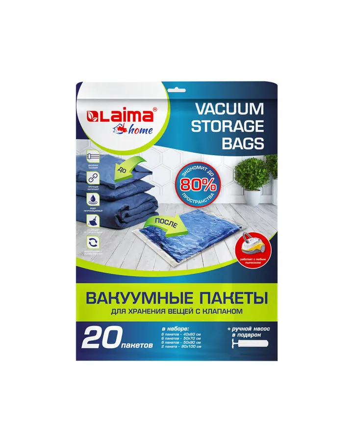 5Вакуумные пакеты Лайма зип для одежды вещей 20 штук с насосом и клапаномКлассные пакеты! Экономят много места в шкафу.