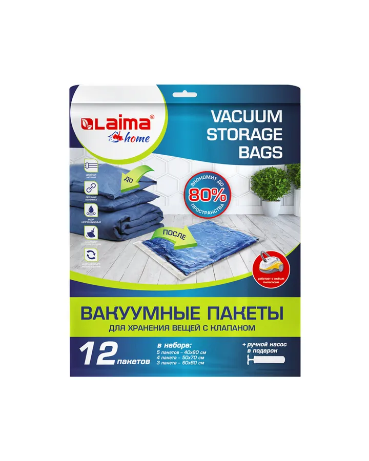 5Вакуумные пакеты Лайма зип для одежды вещей 12 штук с насосом и клапаномОтличные пакеты! Места заняло в 3 раза меньше.👍