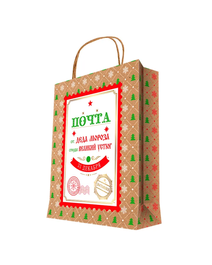Пакет подарочный новогодний Феникс Презент Почта Деда Мороза из крафт-бумаги 26*33*13см
