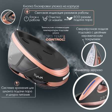 Парогенератор VLK Vesuvio-5400, мощность 2400Вт, паровой удар 350г/минВ общем парогенератор понравился. Посмотрю в дальнейшем как себя покажет в работе. Читала в отзывах что на подошва утюга прилипает к ткани, поэтому одела специальную накладку