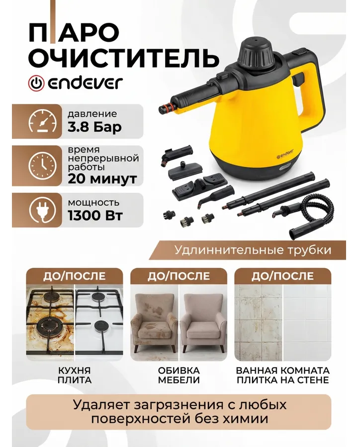 Универсальный пароочиститель ENDEVER Odyssey Q-444Упаковка такая,что в футбол играть можно, образно конечно,но не пожалели пленок. надо к нему привыкнуть. пока попробовала только насадку скребок для зеркал, не очень её поняла,если честно, но в любом случае изначально я брала для обработки детской и для одежды. на данный момент всё работает, посмотрим сколько прослужит