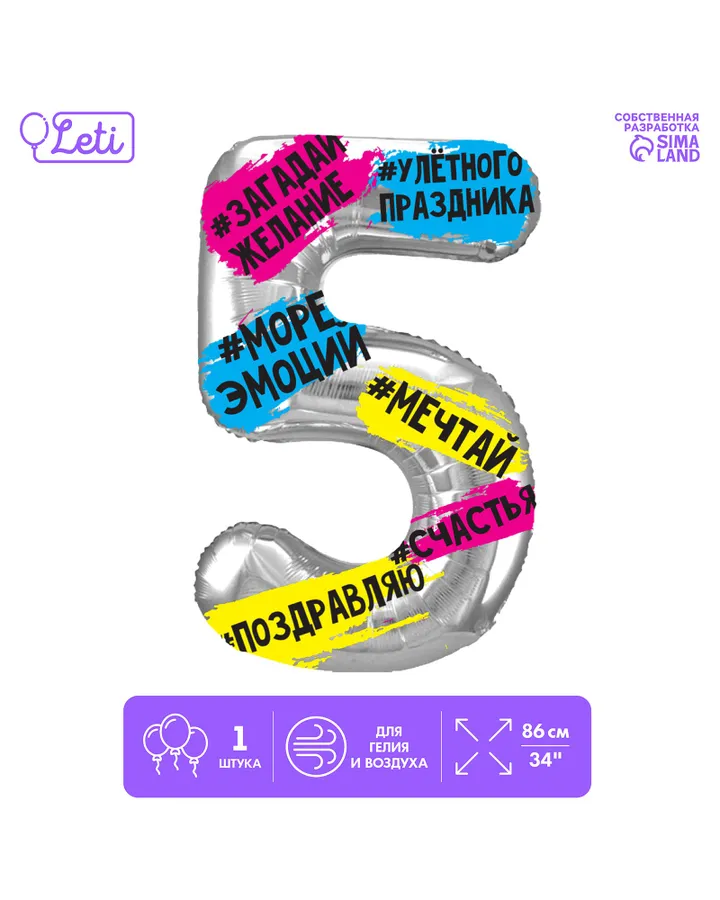 Шар LETI фольгированный 34» Цифра 5 хештеги