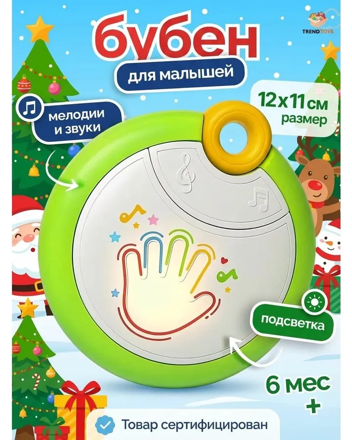 Игрушка музыкальная TrendToys игрушка погремушка бубенОчень удобный музыкальный бубен-компактный размер позволяет брать его везде с собой, ребёнку хорошо держать в руке. Весёлая зажигательная музыка, очень понятное управление. Рекомендую 👍