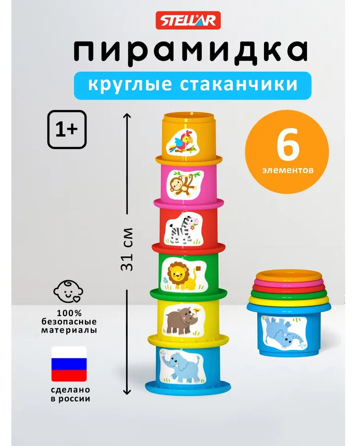 Высокая башенка получается. Мелкому ребенку стаканчики собрать сложно, но из собранных сын в 2,5 года строит высокую башню и сбивает мячом. Увлекательный для него процесс, пирамидку рекомендую