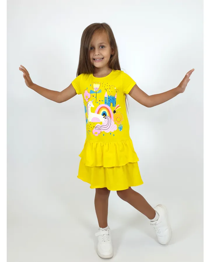Красивое платье, горловина и правда широкая. На рост 107см размер 110 в самый раз , чуть запас есть по рукавам. Не маломерит.