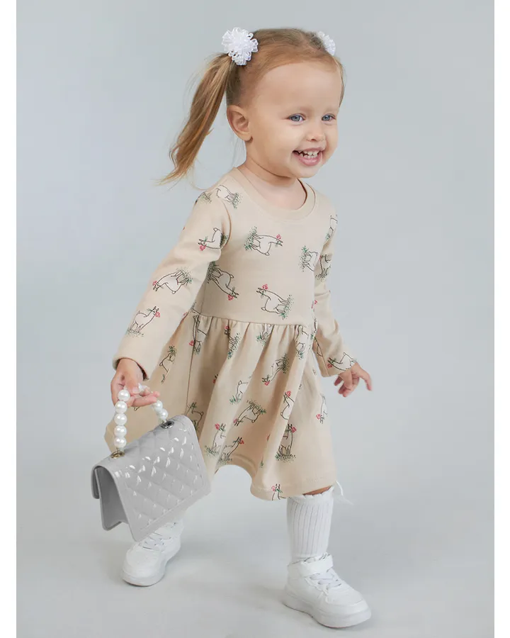 Плотное, хлопковое, в садике носить очень хорошо, быстро снимается и одевается.