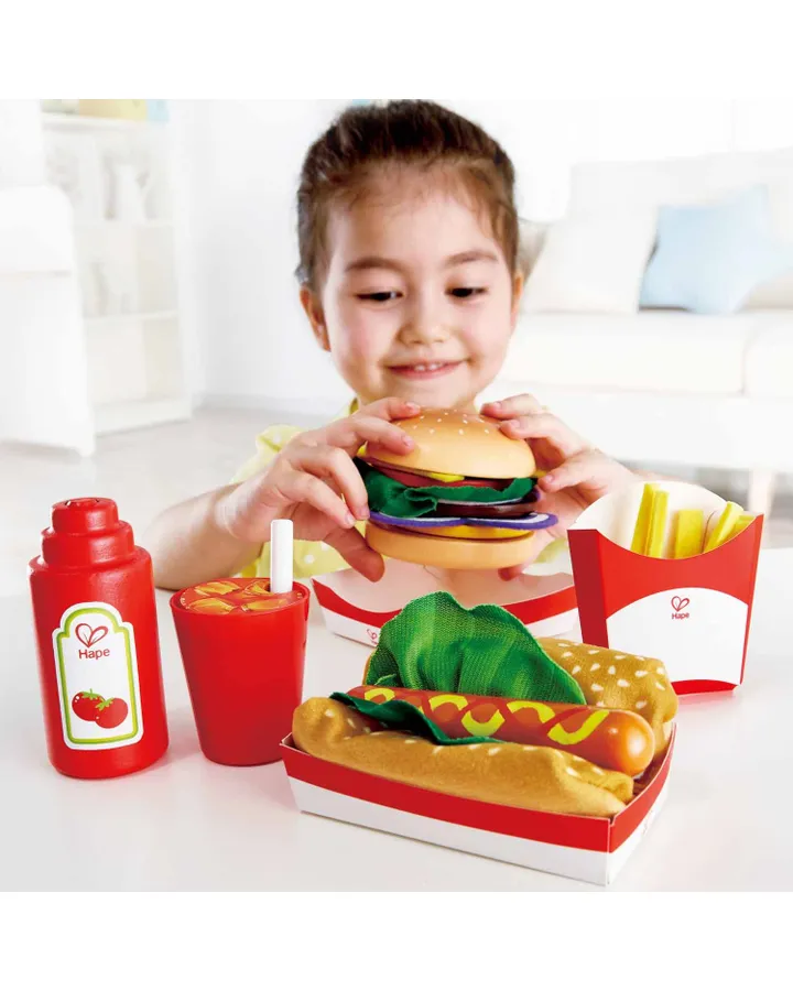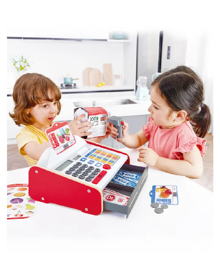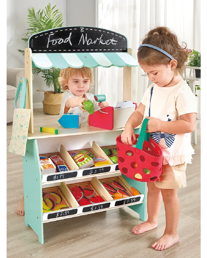 5Игровой набор Hape продукты, прилавок, касса, тележки и корзинкиРебёнок доволен и играет с интересом.