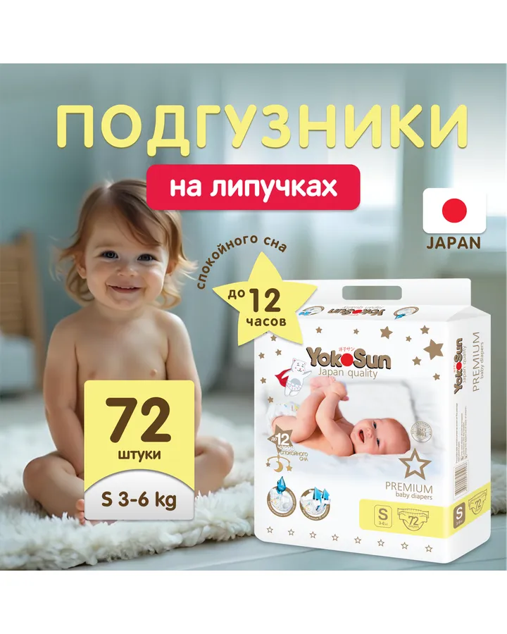 Подгузники YokoSun Premium S (3-6 кг) 72 шт.