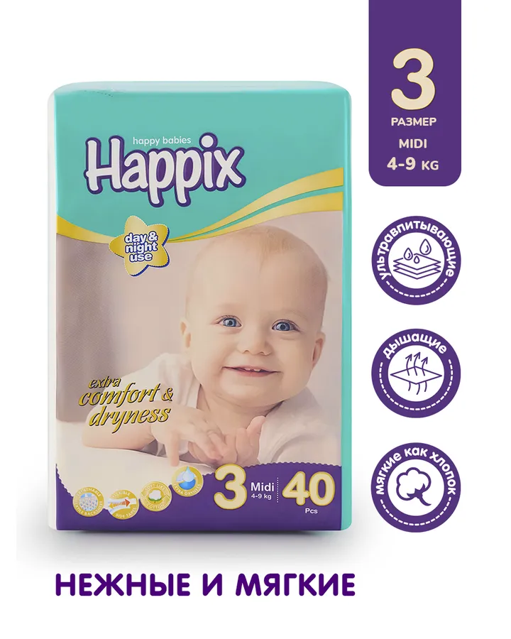 Подгузники HAPPIX Super Dry ультратонкие 4 (7-18 кг) 36 шт.Быстрая доставка, упакованы в коробку, мягкие, не протекают.