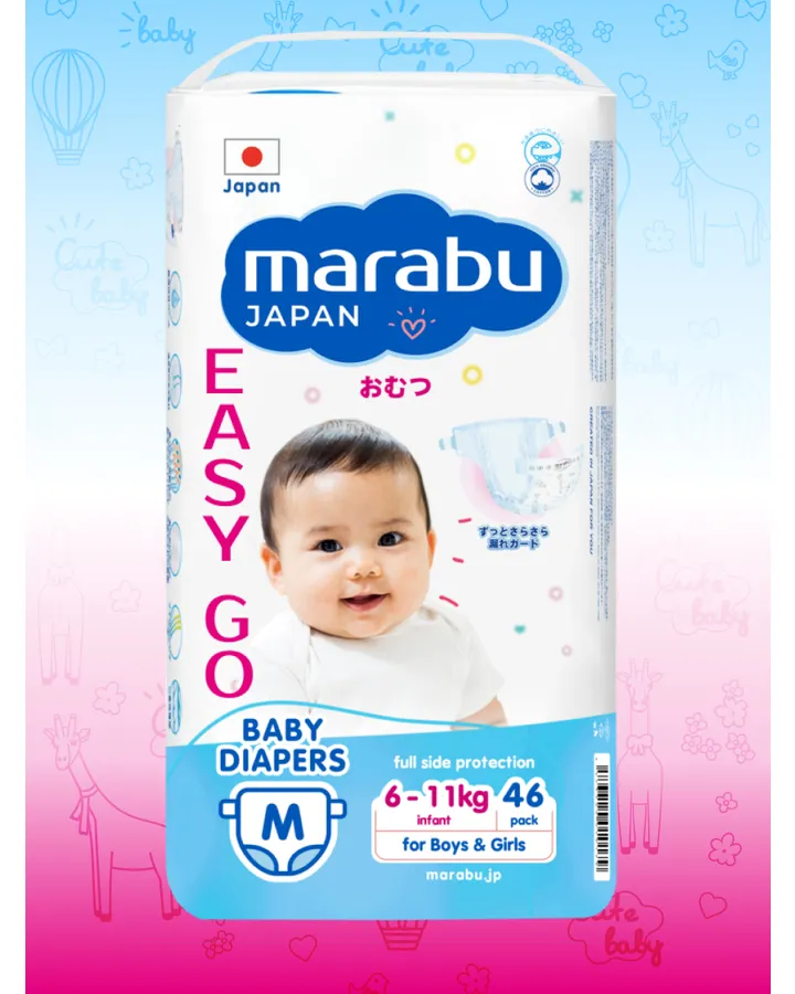 Подгузники MARABU M 46 шт.Это самые лучшие памперсы. Пробовала много разных фирм. Здесь идеально всё: замечательно и равномерно впитывают, не отвисают, не краснеет под ними-они тонкие. И даже серый дизайн глазам приятен!