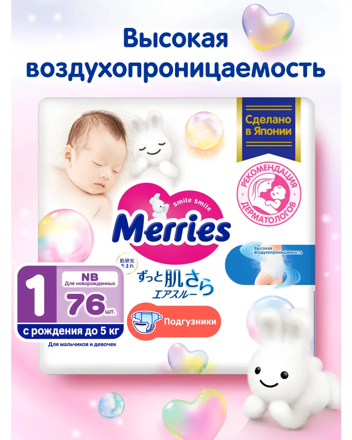 Подгузники Merries для новорожденных NB (5 кг) 76 шт.
