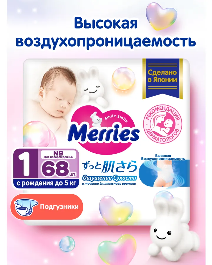 Подгузники Merries для новорожденных 1 (до 5кг) 68 шт.