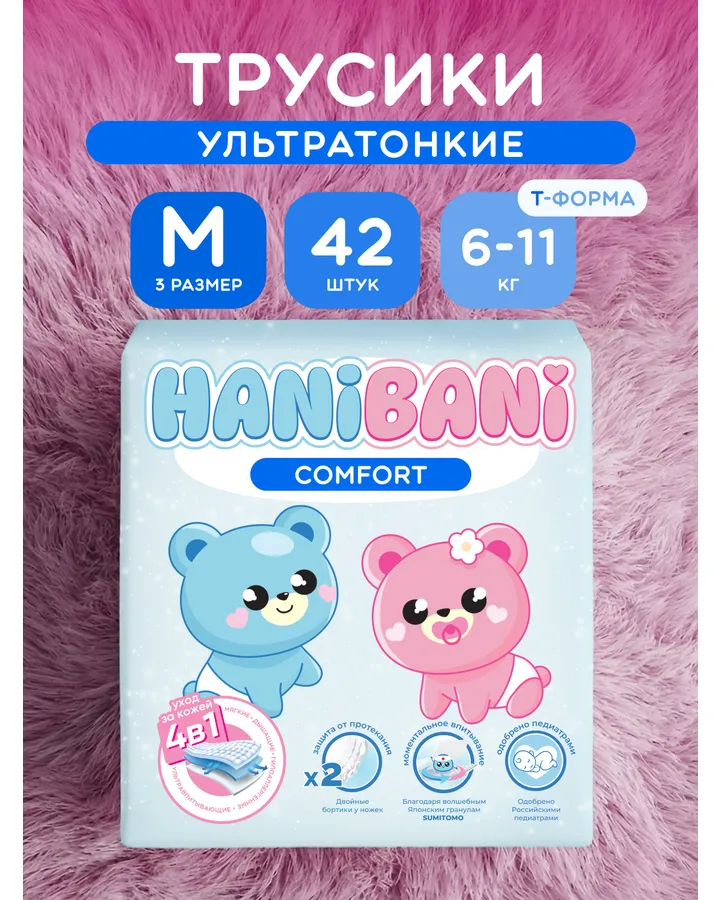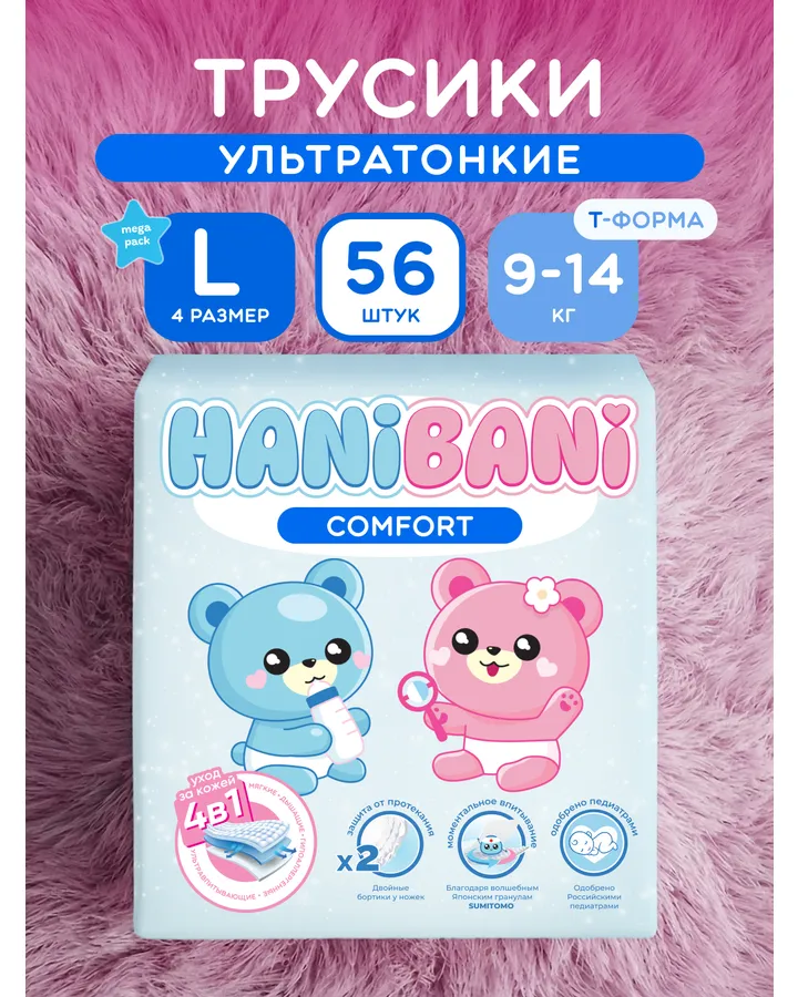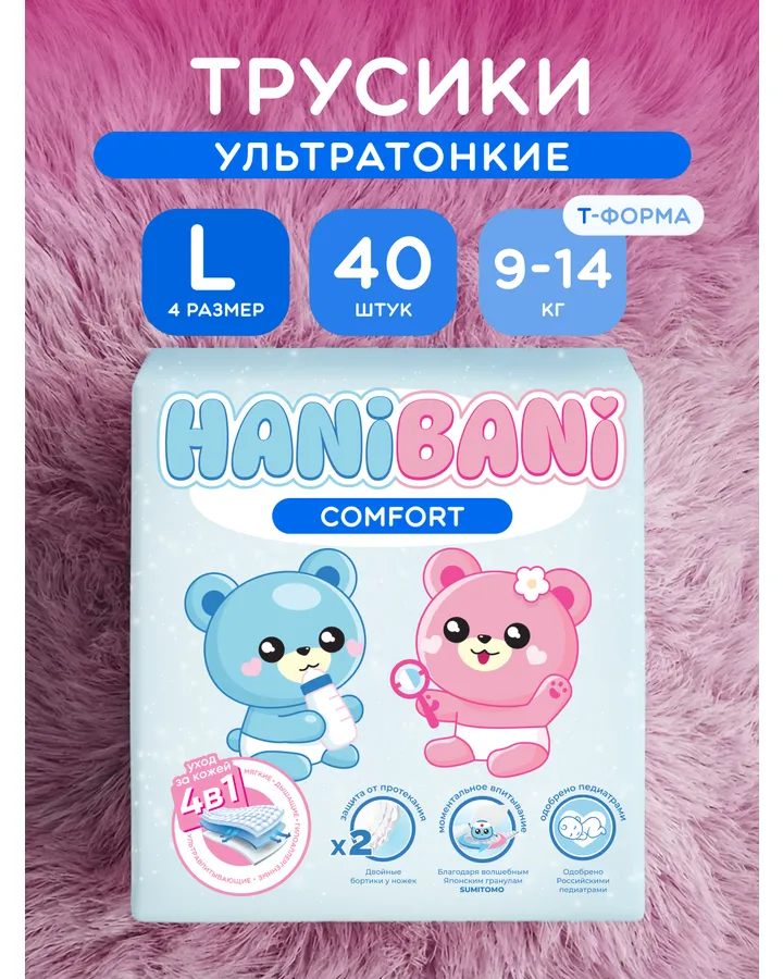 Подгузники HANIBANI Comfort L 40 шт.Любимые трусики. И комфорт, и премиум, и ночные - все отличные. Никогда не бывает сырой попы. Никаких покраснений. Брала с собой летом в Турцию, жара за 40, ребенок только в трусишках и всё под ними отлично 👌