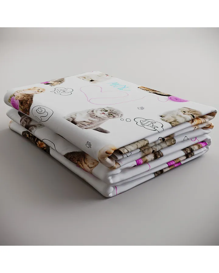 5Пододеяльник Сказка. Котики 145 x 215 смНе линяет, качество хорошее. Немного присутствует чувство брезента как-будто. В целом приятный материал.