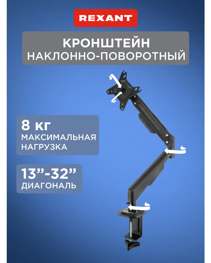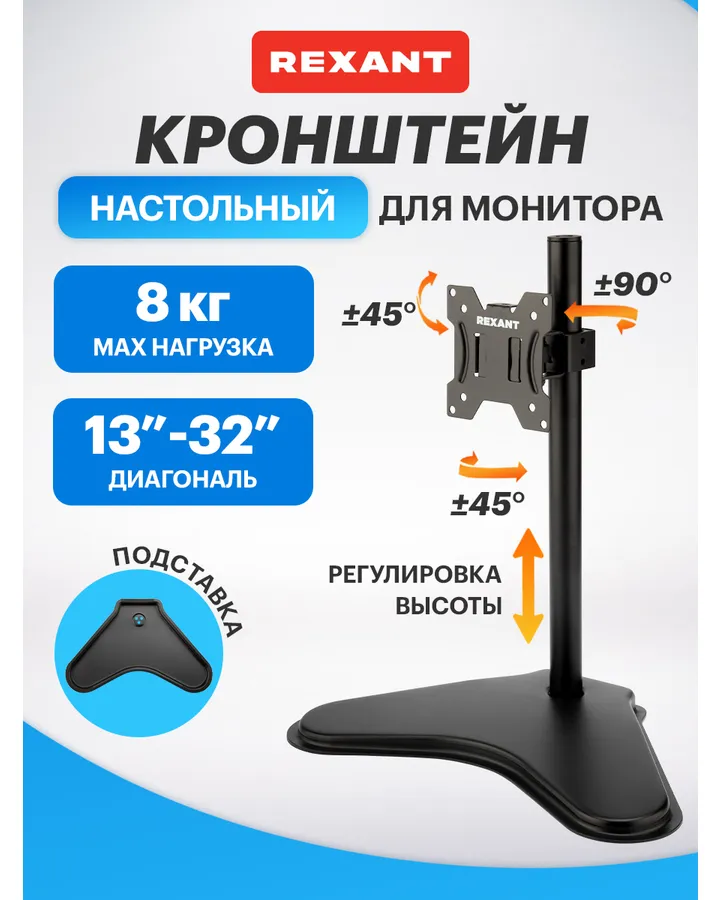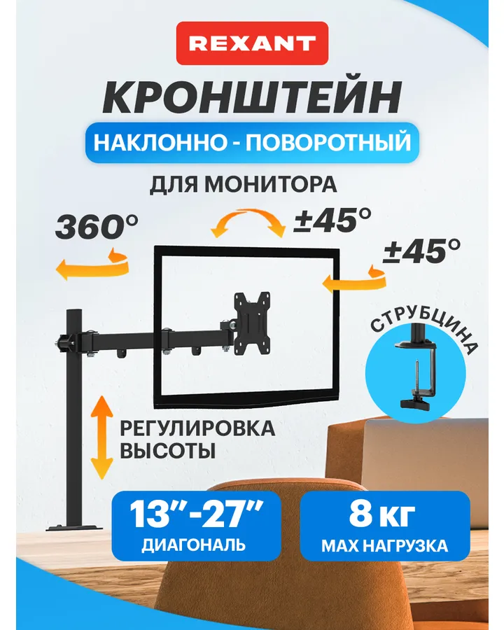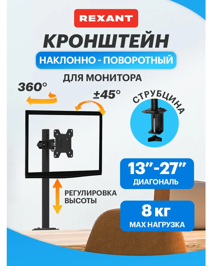 5Кронштейн настольный REXANT для монитора 13-27 дюймов с газлифтомОбалденный кронштейн. Брал два. Отлично встали!