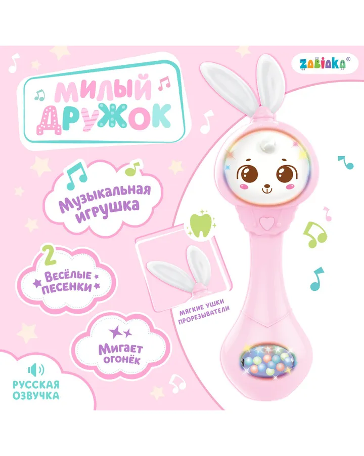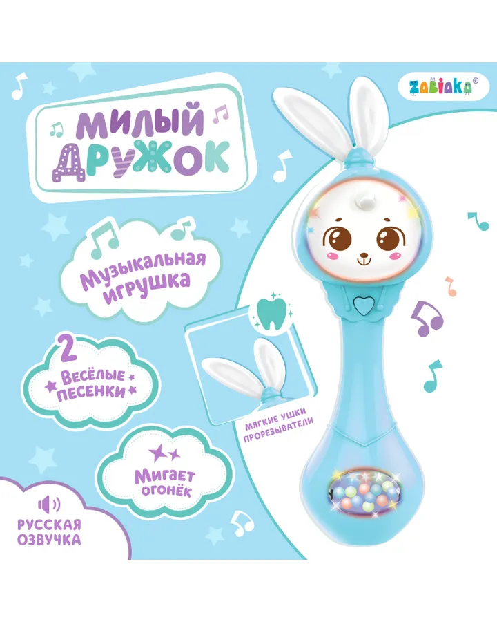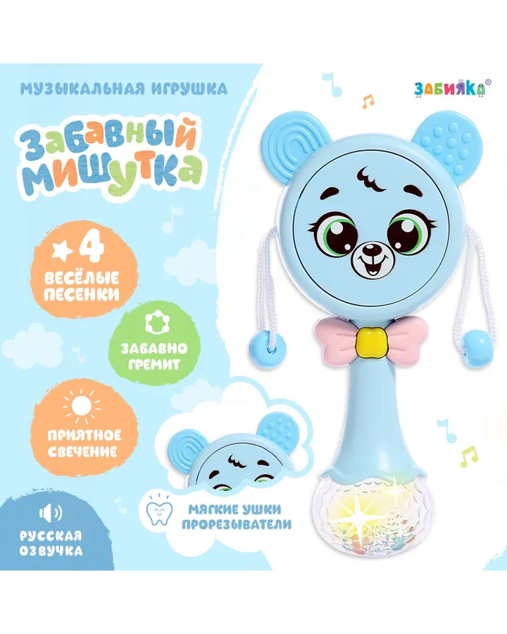 Песенки на русском, текст внятный , достаточно громкая , ребенку нравится держать за веревочки .
