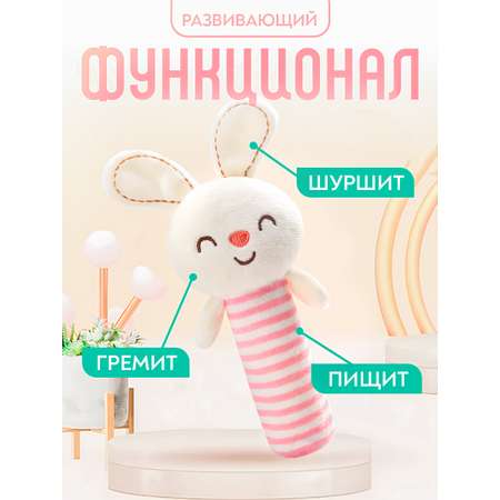 Зайчик-погремушка имеет необычную форму, что очень удобно для захвата детской ручкой. Лапки сделаны из структурного пластика, их можно погрызть. Играть с такой красотой одно удовольствие.